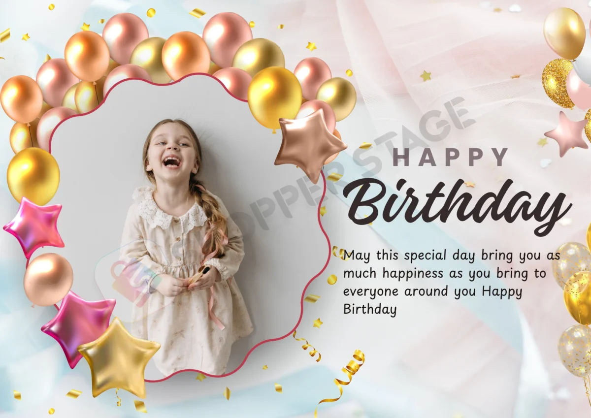 Add extra sparkle to your child’s birthday with this bubbly and cheerful birthday frame. With metallic star balloons, pastel background, and space for a smiling photo, it’s perfect for kids who love laughter and fun. Customizable for names, wishes, or messages to share digitally or in print.