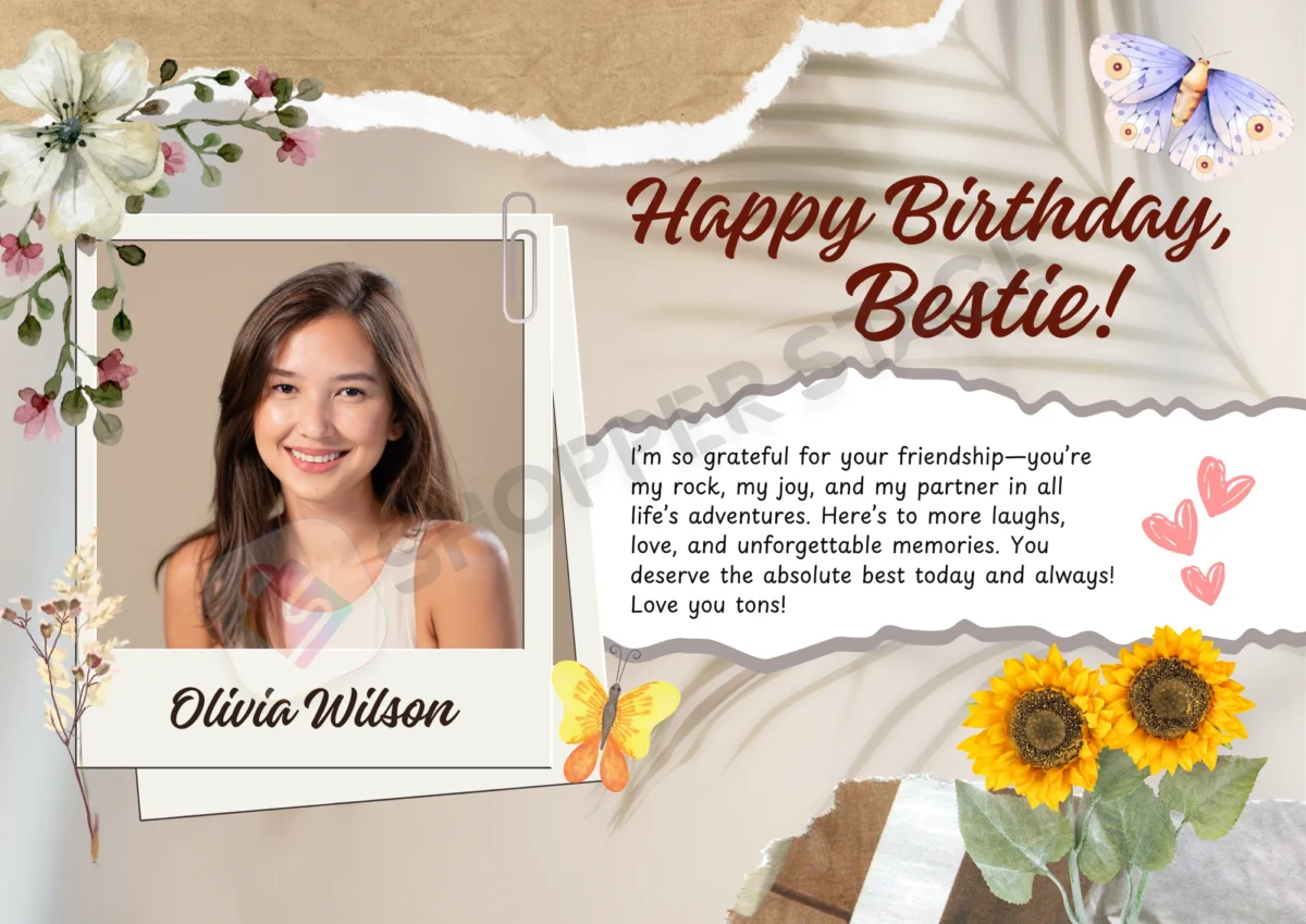 Celebrate your bestie’s special day with this warm and artistic Floral & Vintage Happy Birthday Frame. Designed with pressed flowers, butterflies, and soft paper textures, it’s the perfect template to add a photo and a heartfelt message. Ideal for sending a personal digital wish or creating a keepsake they’ll cherish forever.